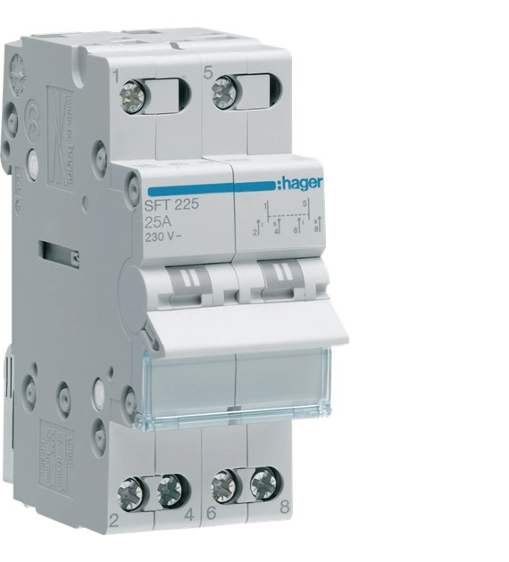 Modułowy przełącznik zasilania instalacyjny sieć agregat I-0-II punkt wspólny od góry 2P 25A 230VAC SFT225 Hager